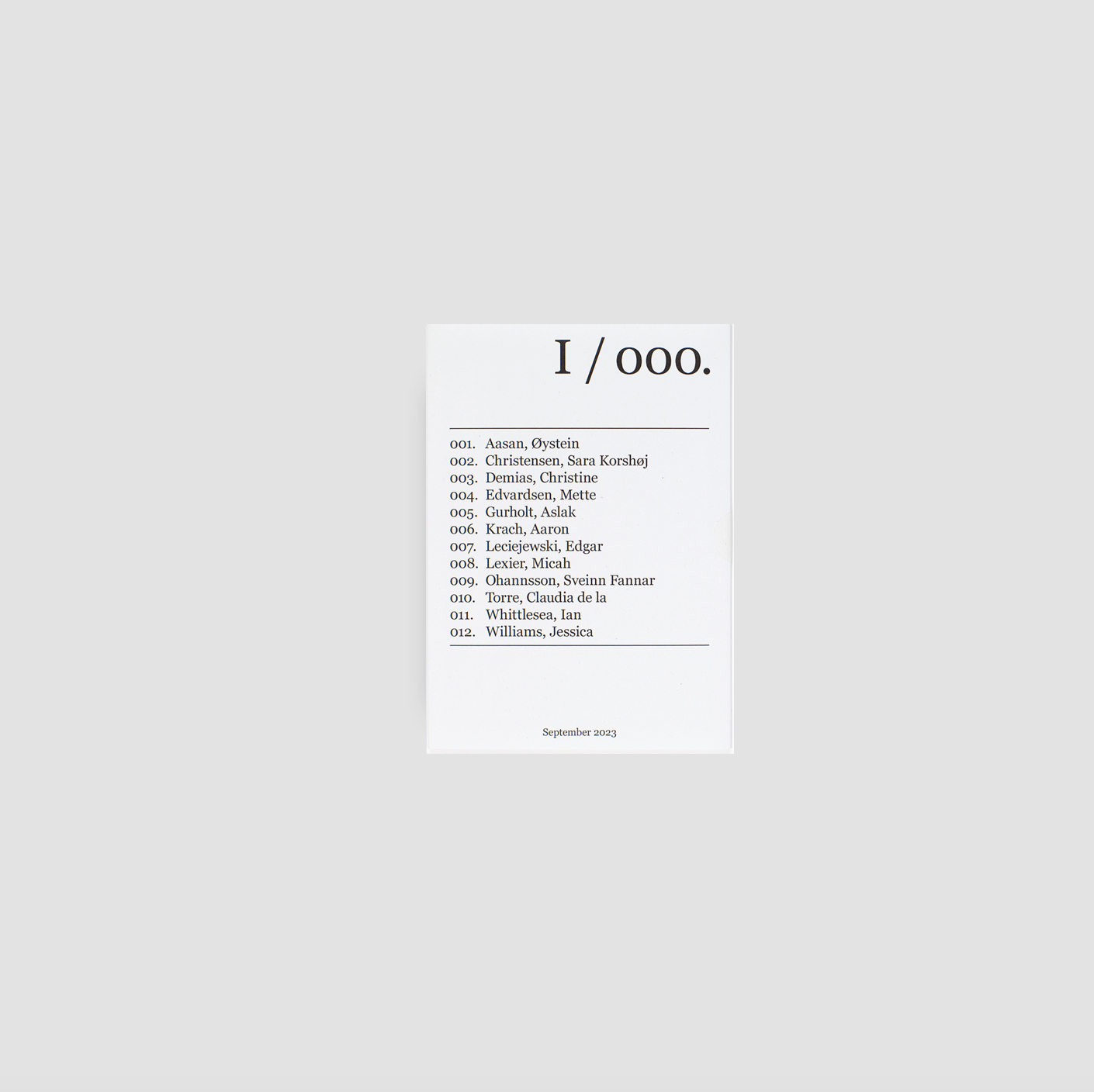 Works by Øystein Aasan, Sara Korshøj Christensen, Christine Demias, Mette Edvardsen, Aslak Gurholt, Aaron Krach*, Edgar Leciejewski, Micah Lexier, Sveinn Fannar Ohannsson, Claudia de la Torre, Ian Whittlesea, Jessica Williams