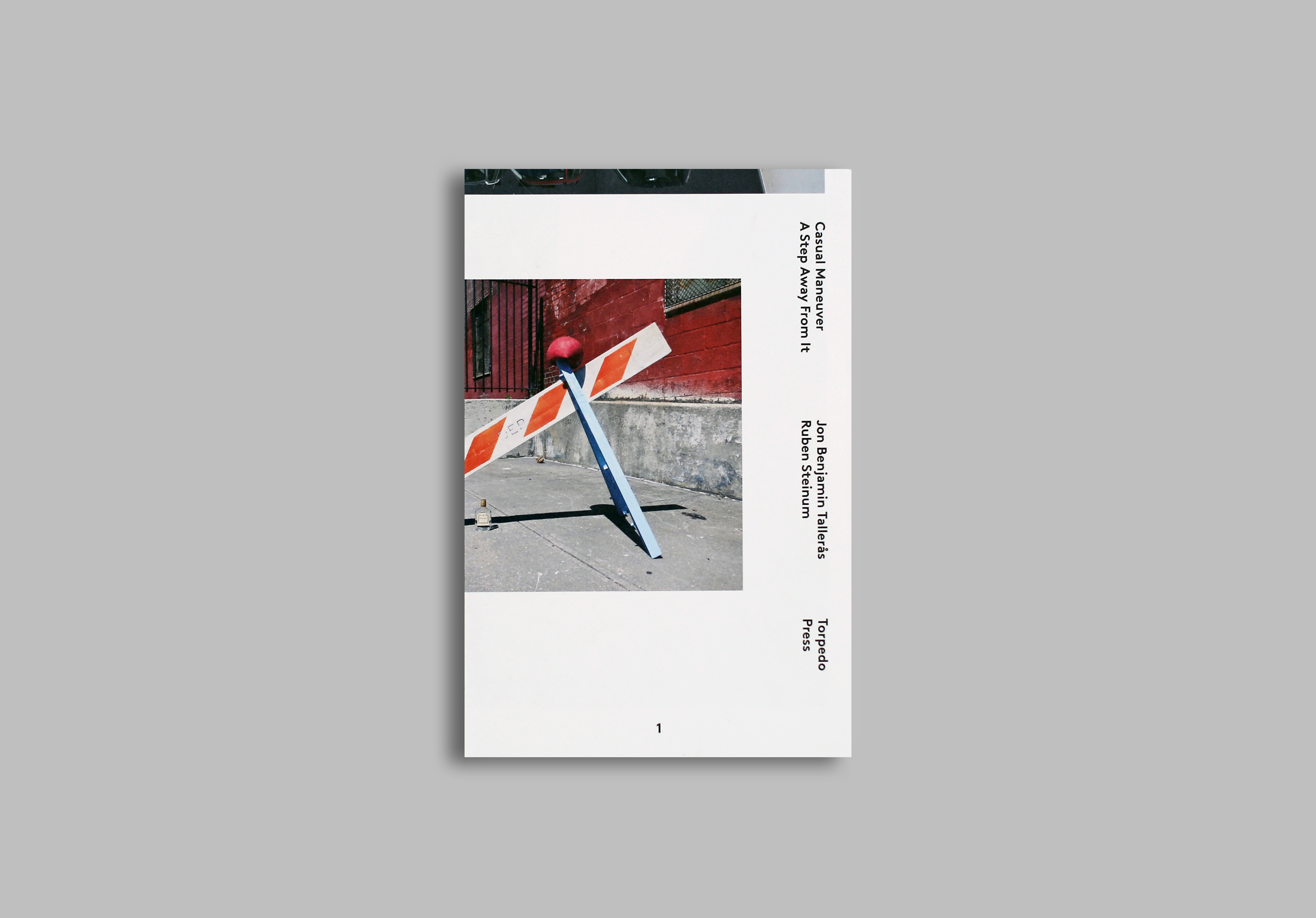 The artists’ book Casual Maneuver: A Step Away From It is made by the Oslo-based artists Ruben Steinum and Jon Benjamin Tallerås. The photographs in the book document almost one hundred unannounced temporary sculptures made in public space over the past three years. Steinum and Tallerås work by clandestinely reconfiguring whatever mobile materials they find on their journeys through various cities. These mostly gentle but unlikely and unexpected transient rearrangements of urban junk and street furniture recall the methods of visual poetry or musique concrète as much as they acknowledge the formal language of contemporary sculpture.